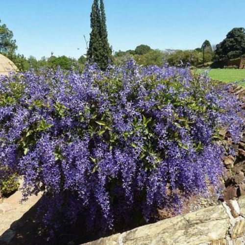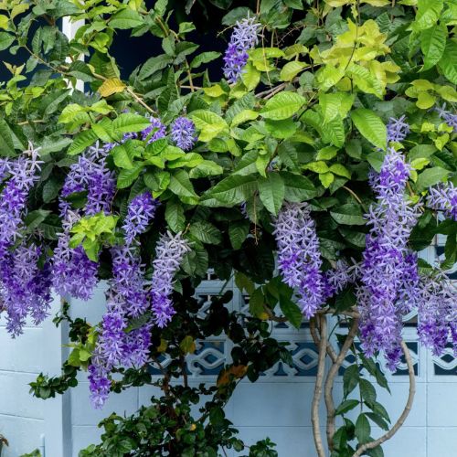 Buy Petrea Volubilis (Queen’s Wreath) climbing vine with vibrant violet-blue flowers and sandpaper leaves. Fast-growing, drought tolerant, perfect for tropical gardens and trellises.